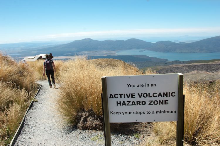 Hiking past the recently erupted area was really interesting.  In addition to views of the massive young crater, we could spot boulders on the ground along the trail that were brought there by the blast.  The trail also passed a hut that had holes ripped in it by rocks from the eruption.  Thankfully, the eruption occurred on a winter night and no one was sleeping in the hut.  There were several interesting warning signs along the trail.  This is actually one of the tamer ones.